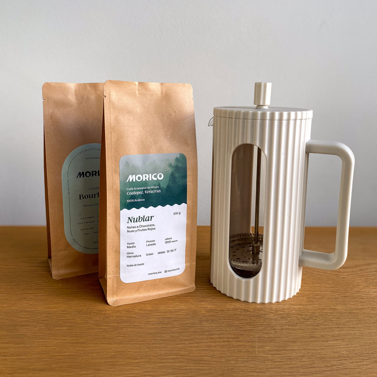 El Dúo 230 + Prensa es la forma más completa de disfrutar el café en casa sin complicarte. Dos cafés a elegir con personalidades muy distintas y una prensa francesa que saca lo mejor de ambos desde la primera preparación.